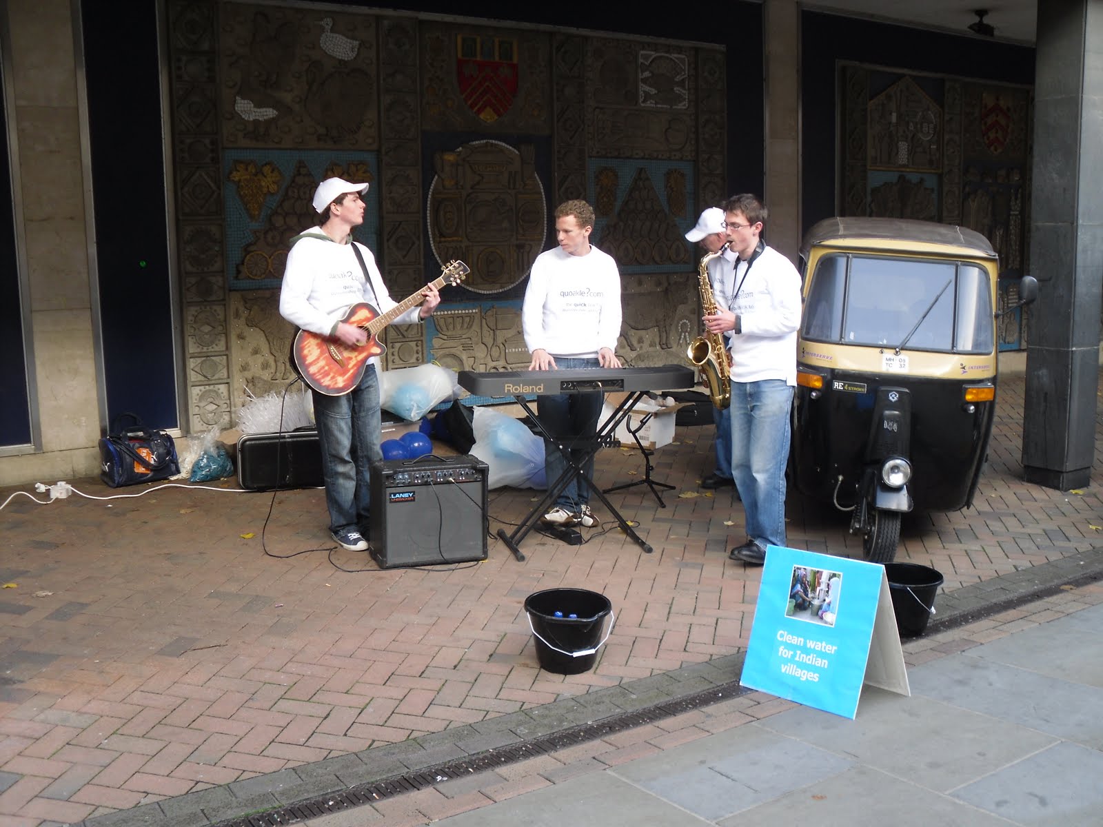 On arriving in Gloucester’s Eastgate Street, the rickshaw was parked in the covered walkway outside BHS, where shoppers were also able to enjoy some quality busking from Quoakle staff cum musicians. On the guitar was Ben Steele, keyboard Mike Gladwell and Saxophone Tim Steele. The weather in Gloucester was fine and so hundreds of people were able to enjoy the music, as well as the children passing by receiving the colourful Quoakle balloons.