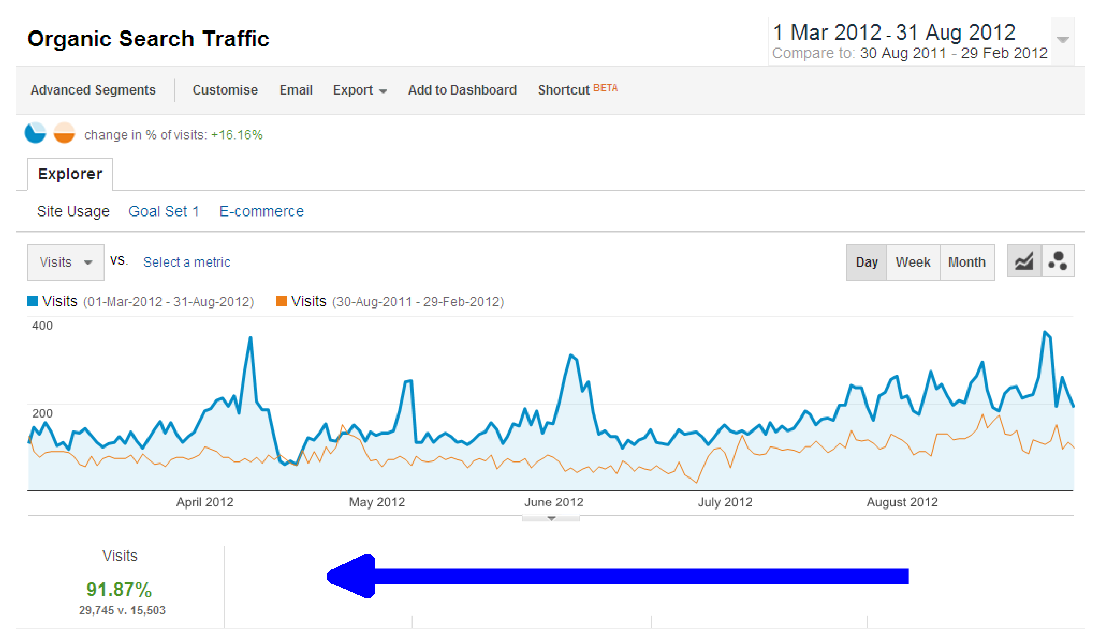 During the last six months, from March 1st to August 31st 2012, the visits to Quoakle from Google’s Organic listings have risen by an exciting 91.87% when compared with the previous six months! Going up from 15,603 to 29,745. This exciting development is largely due to Quoakle’s strong performance from its Days Out and Leisure pages in the Google listings .